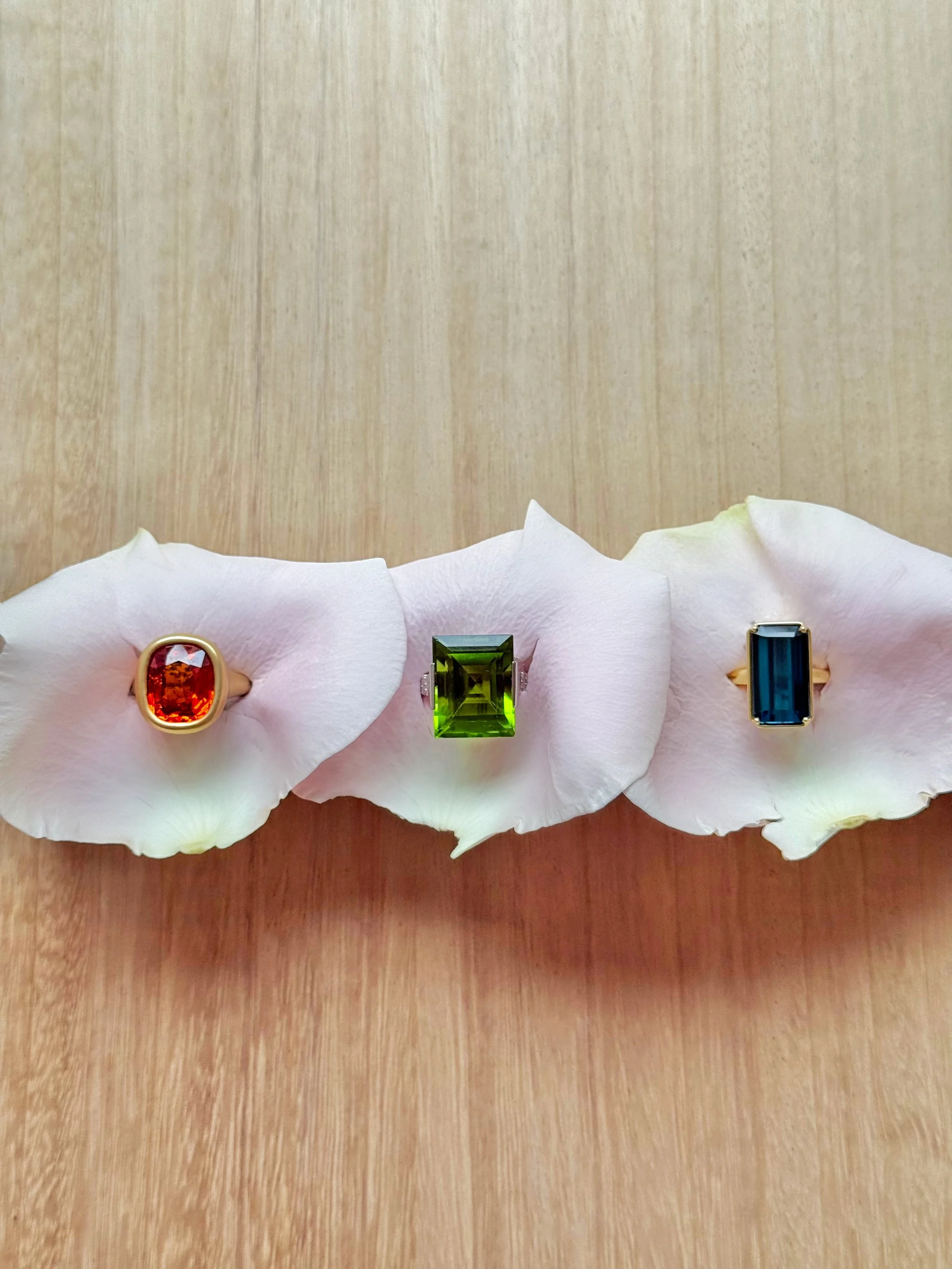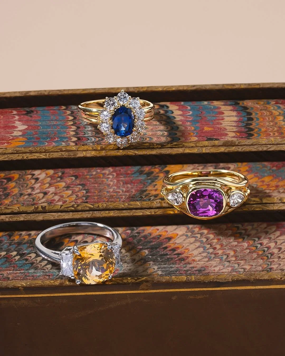 Fine jewelry imagery highlighting rare, hand-selected gemstones, photographed within Upstairs at Long’s. The work centers color, material presence, and design clarity across a range of distinctive stones.