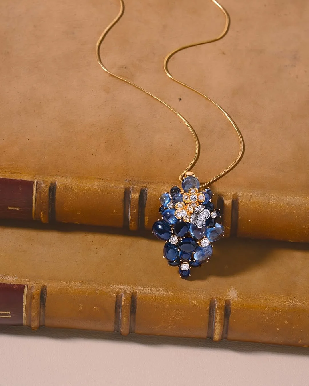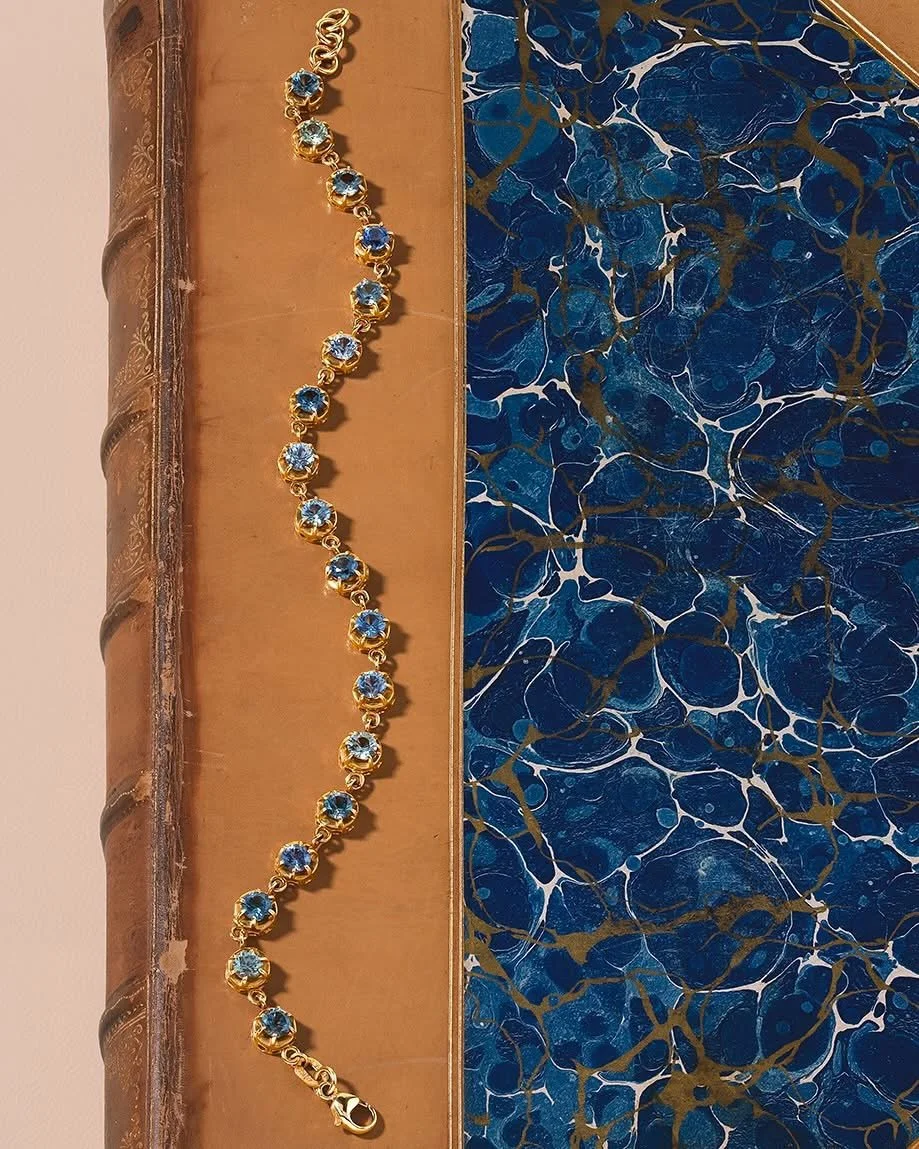 A focused editorial exploration of sapphire jewelry staged atop antique leather-bound and marbled books. The setting was conceived to reference scholarship, provenance, and the enduring nature of fine stones.